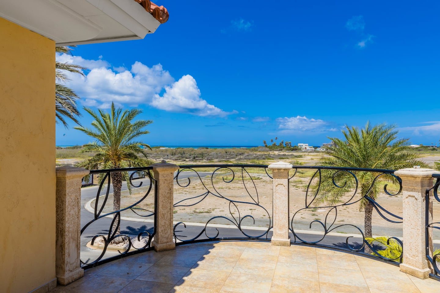 This two-story precious and luxurious 307 m2 estate is built on 804 m2 of private property land in one of the best residential areas in Aruba, close to the Palm Beach, Malmok Beach and Arashi Beach, shopping malls, high rise hotels and casinos. Entering this villa through the front door you will find on the ground floor on your right-hand side a dining area and a fully equipped kitchen and on the left side the living area. The corridor on the left side will lead you to the first bedroom with its private bathroom and walk in closet and a balcony overlooking the blue ocean of Aruba. In the back of the kitchen area, you will find a garage and a smaller second bedroom with a bathroom, private entrance and also accessible from the backyard. On the left side of the entrance, you can go to the second floor via beautiful staircase and on the right side you will find the master bedroom, private bathroom with a jacuzzi, walk in closet, and a huge balcony overlooking the ocean. On the right side of the staircase, you will find the fourth bedroom, with own balcony, bathroom and a walking closet. The backyard consists of a large patio with high quality tables and chairs, a BBQ grill that overlooks the beautiful swimming pool with a waterfall. A unique estate, premier elegancy, a must see!