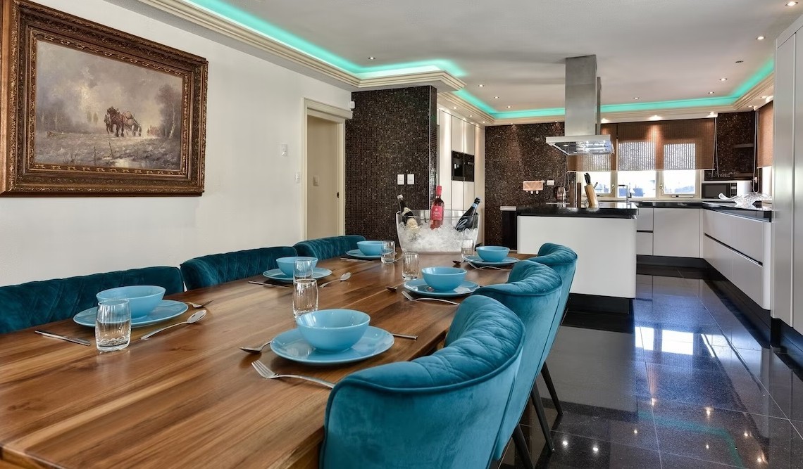 Casa Piu Bella boasts a total of 8 bedrooms, ensuring an abundance of space for both intimate family gatherings and grand soirees. The four bathrooms and one-half bathroom are adorned with lavish fixtures, providing a spa-like retreat for relaxation and rejuvenation. Step into the heart of the home, a modern, fully equipped kitchen where culinary dreams come to life amidst a symphony of high-end appliances and bespoke finishes.