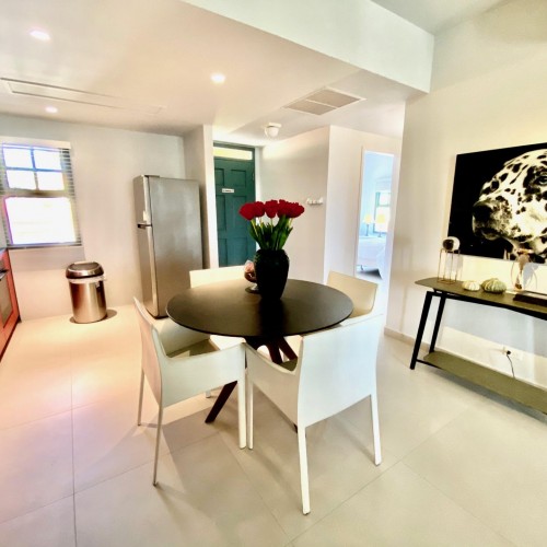 This beautiful and charming condo with nice modern Italian ceramic tile flooring throughout all rooms is located in well-known Tierra del Sol Resort and Golf Club, a few feet away from the only 18-hole golf course in Aruba. The residence offers you relaxed elegance, comfort and privacy and consists of a large master suite featuring spacious closets and private bath with double sink vanity, a large guestroom with ample closet space, a luxurious guest bathroom, spacious living and dining areas, fully equipped modern kitchen and a covered terrace overlooking the golf course and the Aruban sun set every single day. The estate is fully and exclusively furnished. Immerse yourself in the incomparable luxury of Tierra del Sol Resort, Spa and Country Club, the most distinguished retreat in Aruba. Discover the countless reasons that have drawn newcomers to this timeless Aruba destination – year after year – for generations. A vast nature preserve right outside your door, brings truly each day endless possibilities, enjoying the extraordinary sense of freedom provided by this popular type of accommodation, clustered within various private and distinctive neighborhoods. There is also a garage on premises. Contact us today for more information. A wonderful place to stay and live. The monthly rent amount is US$ 2,500 excluding utilities and including a garage for one car. Contact us today for more information.