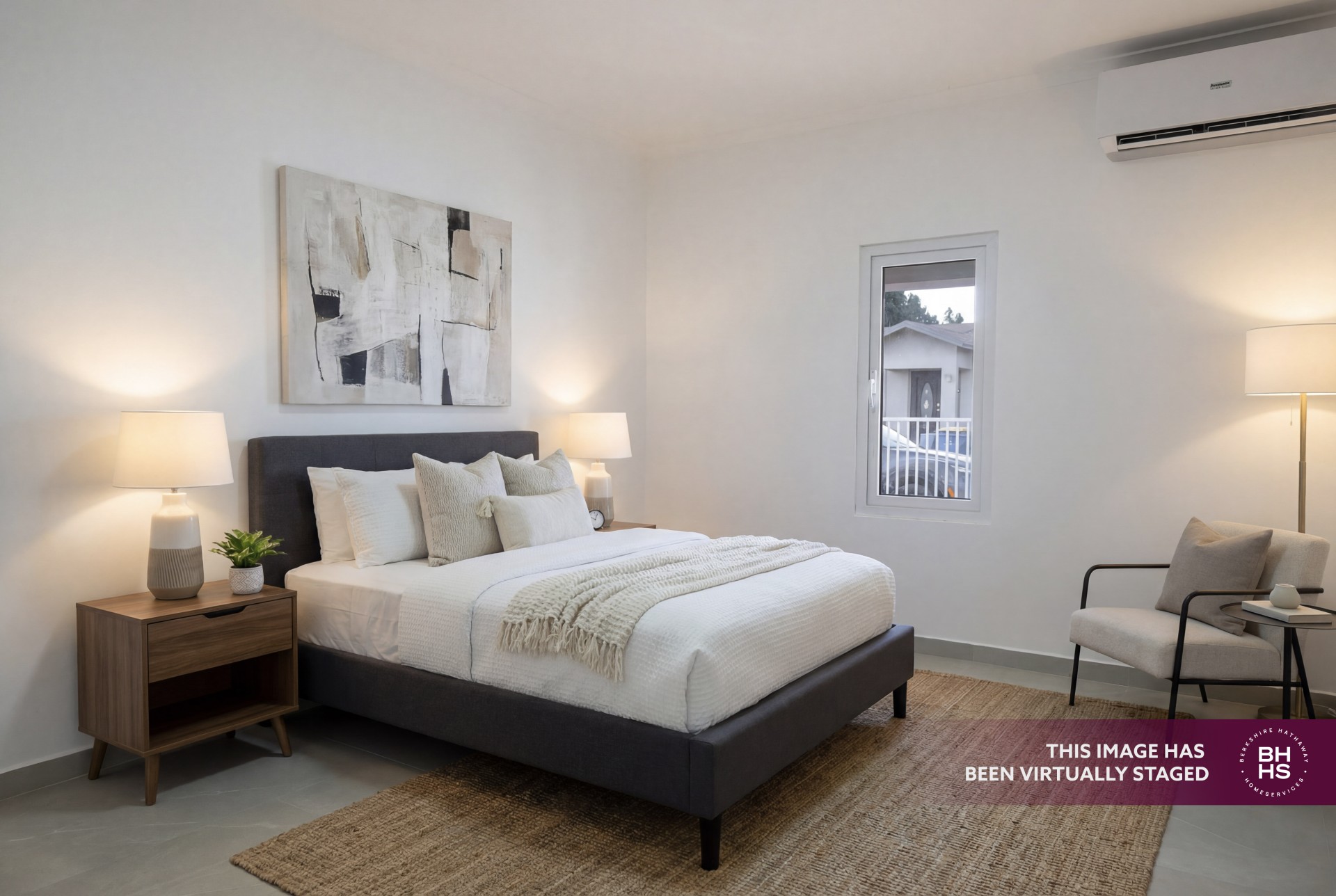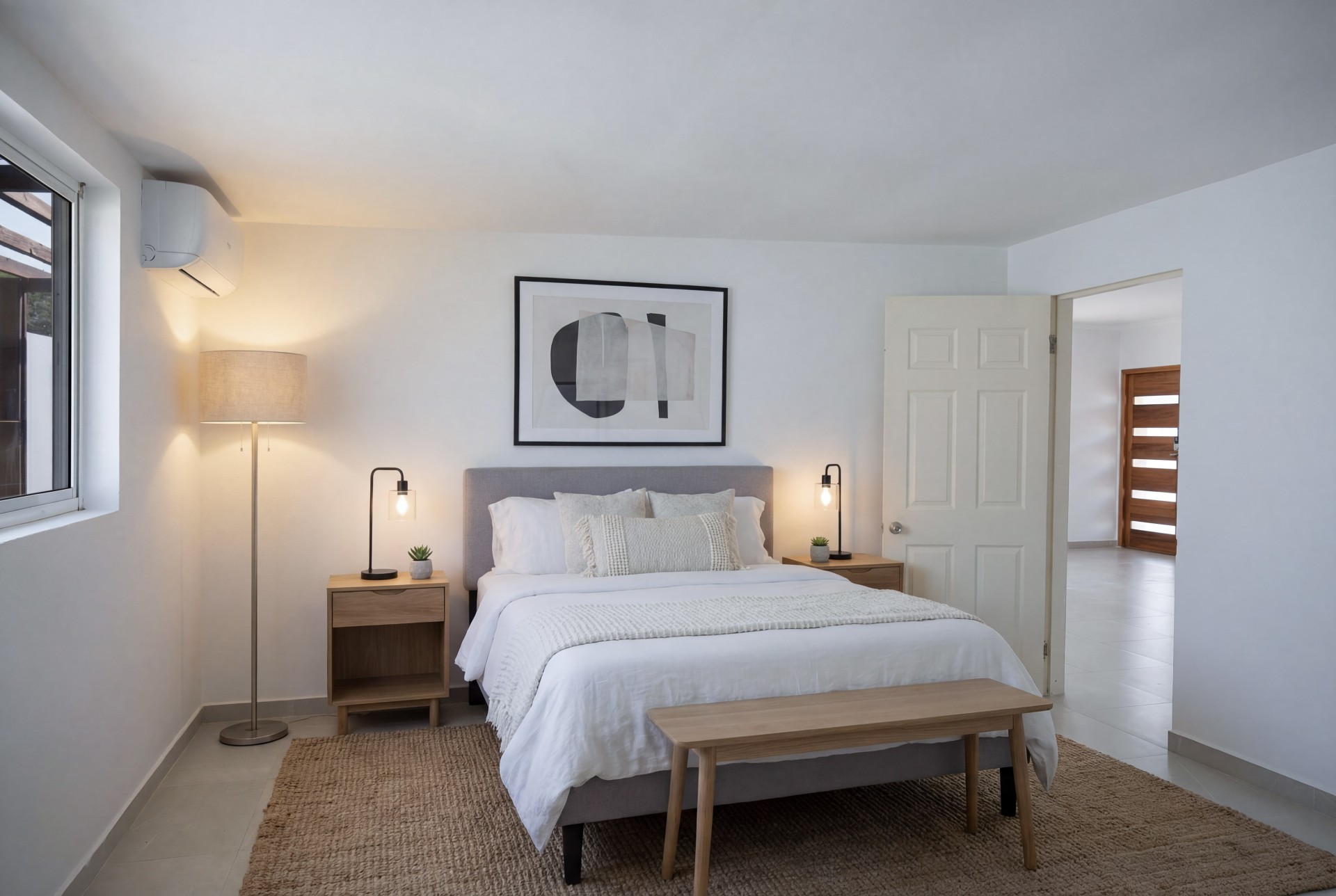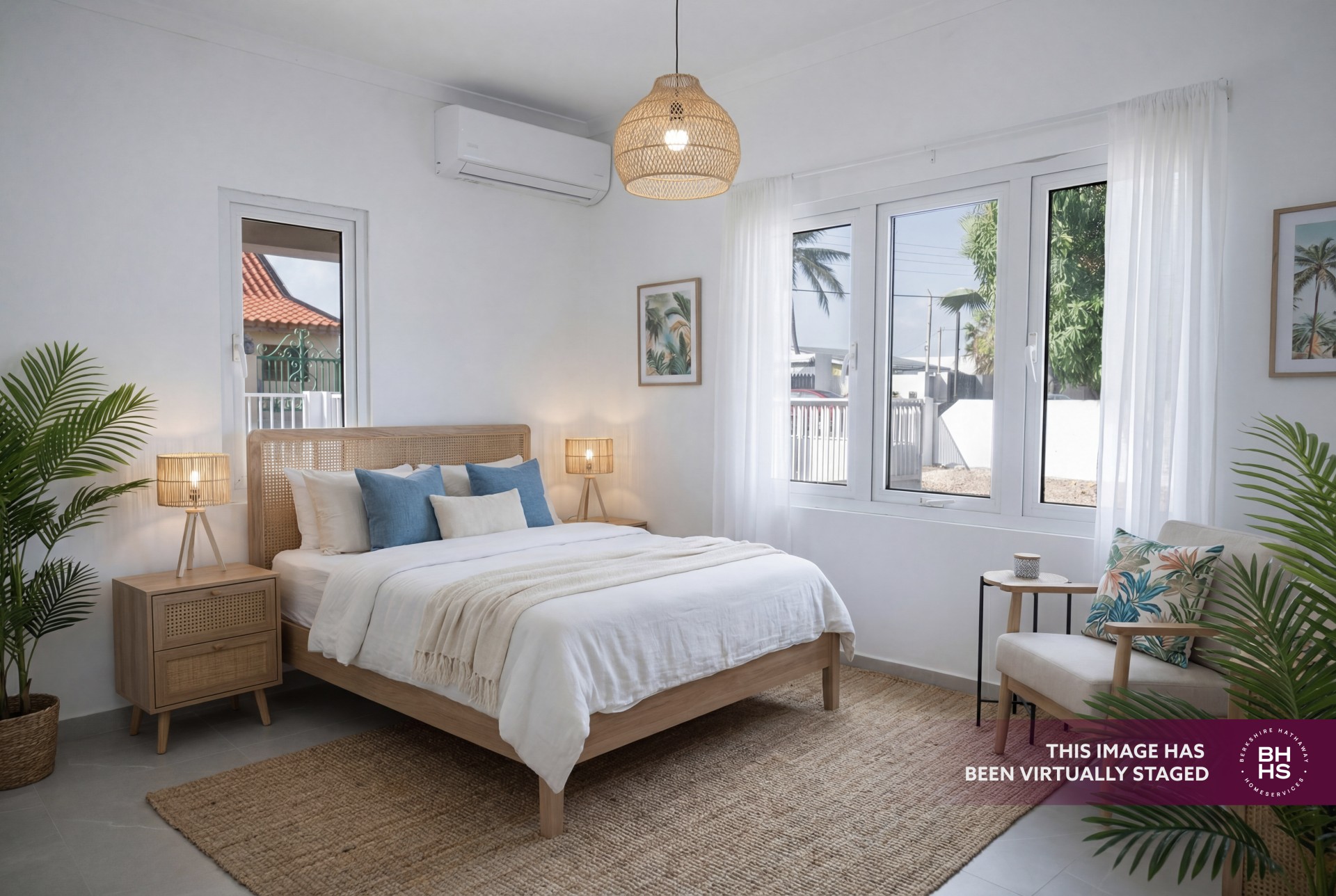 The open-concept living, kitchen, and dining area creates a bright and functional layout with direct access to a covered patio, ideal for outdoor living. The master bedroom includes an ensuite bathroom and walk-in closet, while the two additional bedrooms share a bathroom. Air conditioning is installed in all bedrooms and the kitchen/dining area.