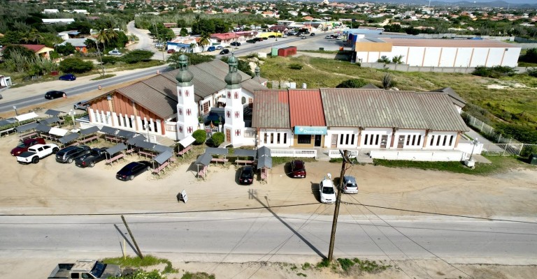 Landmark Rococo Plaza in Aruba is now for sale. Rocco Plaza is located along the main road of Tanki Leendert and immediately recognizable by its two unique 17th century red copper domes at the entrance. It's unique and artistic domes at the entrance attract every single day a great number of tourists and local customers to the place. Rococo Plaza consists of several commercial units that are rented out. Rococo Plaza is also known for the incredible collection of European Antiques and Curiosities that is displayed in more than 20 showrooms within the plaza. The property has a land size of 2377 m2 and a total built up area of 1652 m2. The premises consist of two buildings (A and B) with two floors, two towers, a refrigerator/freezer room, a toilet block with storage and a transformer house. Building A ground floor consists of the following: office spaces, showrooms, storage, kitchen, ladies and gentlemen's toilet. Building A first floor consists of the following: showroom and storage. The total built-up area of building A is 798 m2. Building B ground floor consists of the following: antique store with office, Domino's Pizza, showrooms, denomination and an apartment. Building B first floor consists of: antique shop, pizza shop, showrooms and an apartment. The total built-up area of building B is 854 m2. The complex is located on two asphalted roads with street lighting. One road is the main road from Tanki Leendert to Paradera and the other is a branch from it which leads in the direction of Modanza. It is located approximately halfway between the Tanki Leendert roundabout and the Paradera roundabout. It is a busy traffic road and there are various homes and many commercial buildings in varying quality and size built around it.