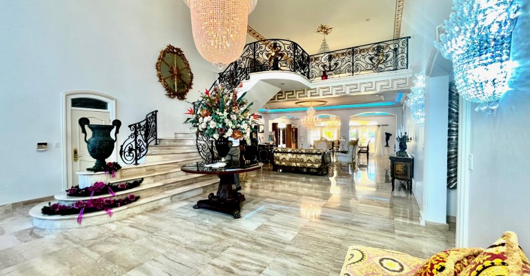 Set on two expansive adjacent lots totaling 36,444 sq ft (3,386 sq m), this residence boasts an impressive 8,452 sq ft (785 sq m) of refined living space. With 5 spacious bedrooms, 5 bathrooms, multiple living and dining areas, and two fully equipped kitchens, the villa is ideal for both intimate family living and grand-scale entertaining.
